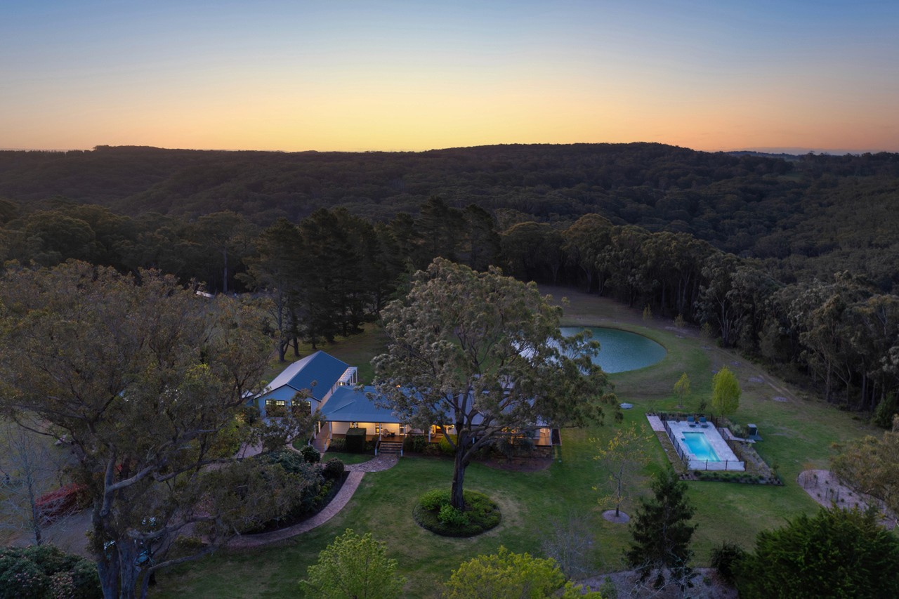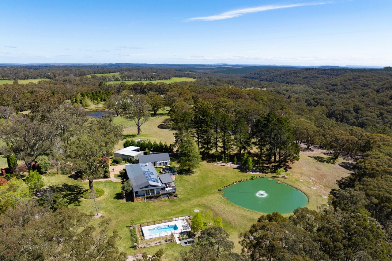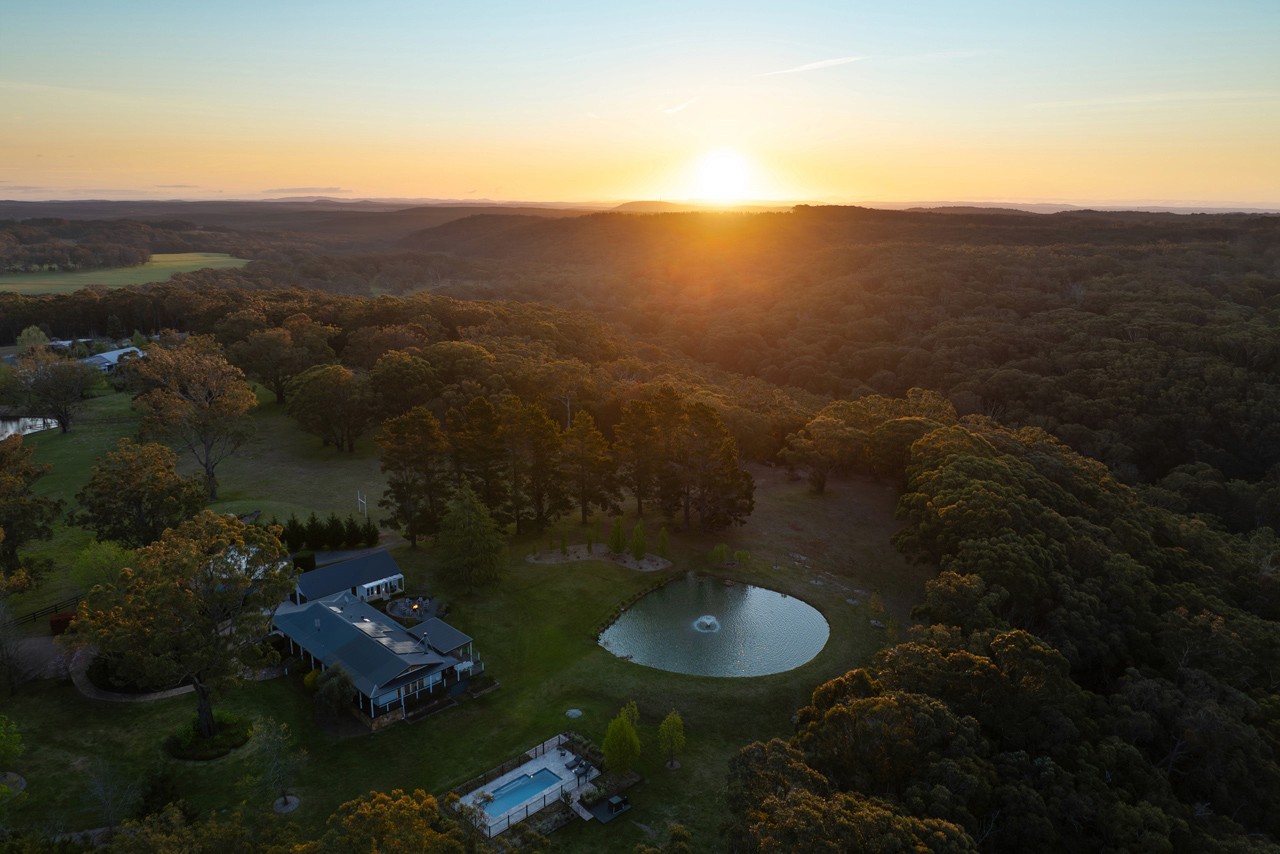 Designed for refined entertaining and relaxed rural living, the estate offers a heated mineral pool, spa, landscaped gardens, firepits, multiple alfresco dining areas and panoramic bushland views.