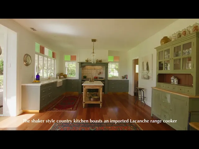 A charming shaker style country kitchen boasts an imported Lacanche range cooker, bespoke cabinetry, Devol UK brassware and kickboards, and fully integrated appliances which flows to the butler’s pantry and laundry.